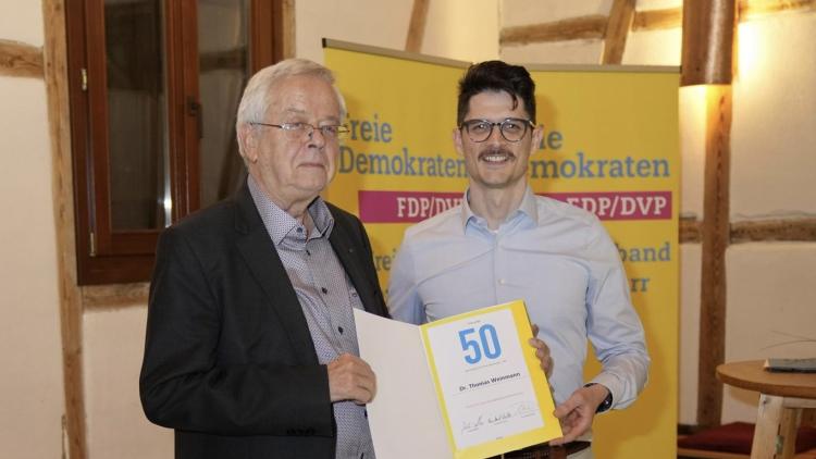 Für 50 Jahre Mitgliedschaft in der FDP wurde Dr. Thomas Weinmann, Träger der Staufermedaille des Landes Baden-Württemberg, geehrt.